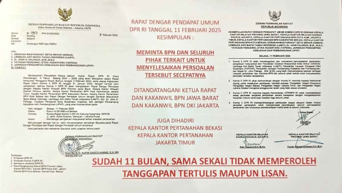Keputusasaan Dr. John Palinggi membawanya hingga ke forum tertinggi: Komisi II DPR RI. Dalam Rapat Dengar Pendapat Umum (RDPU) undangannya ditandatangani Wakil Ketua DPR RI Prof. Dr. Ir. H. Sufmi Dasco Ahmad, S.H., M.H., dan Kesimpulan RDPU ditandatangani Ketua Rapat, Kepala Kanwil BPN DKI Jakarta didampingi Kepala Kantor Pertanahan Jakarta Timur bersama Kepala Kanwil BPN Jawa Barat didampingi Kepala Kantor Pertanahan Kota Bekasi dengan rekomendasi meminta BPN dan seluruh pihak terkait untuk menyelesaikan hal tersebut secepatnya.